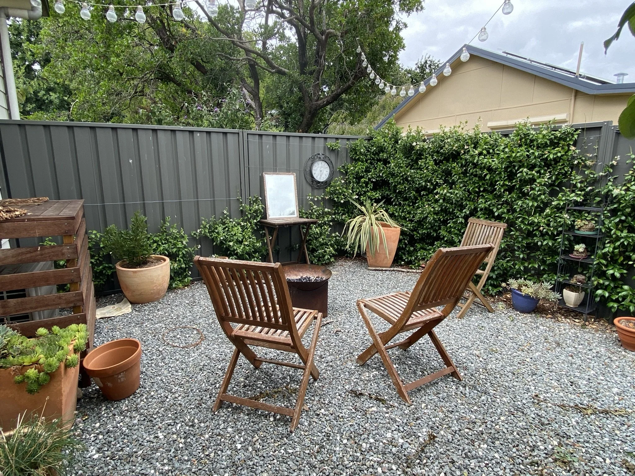This dead space at the side of the house has been transformed into a green room with climbing star jasmine disguising the surrounding fence. This previously unused area is now a favourite spot for outdoor entertaining and family gatherings around the firepit in winter.